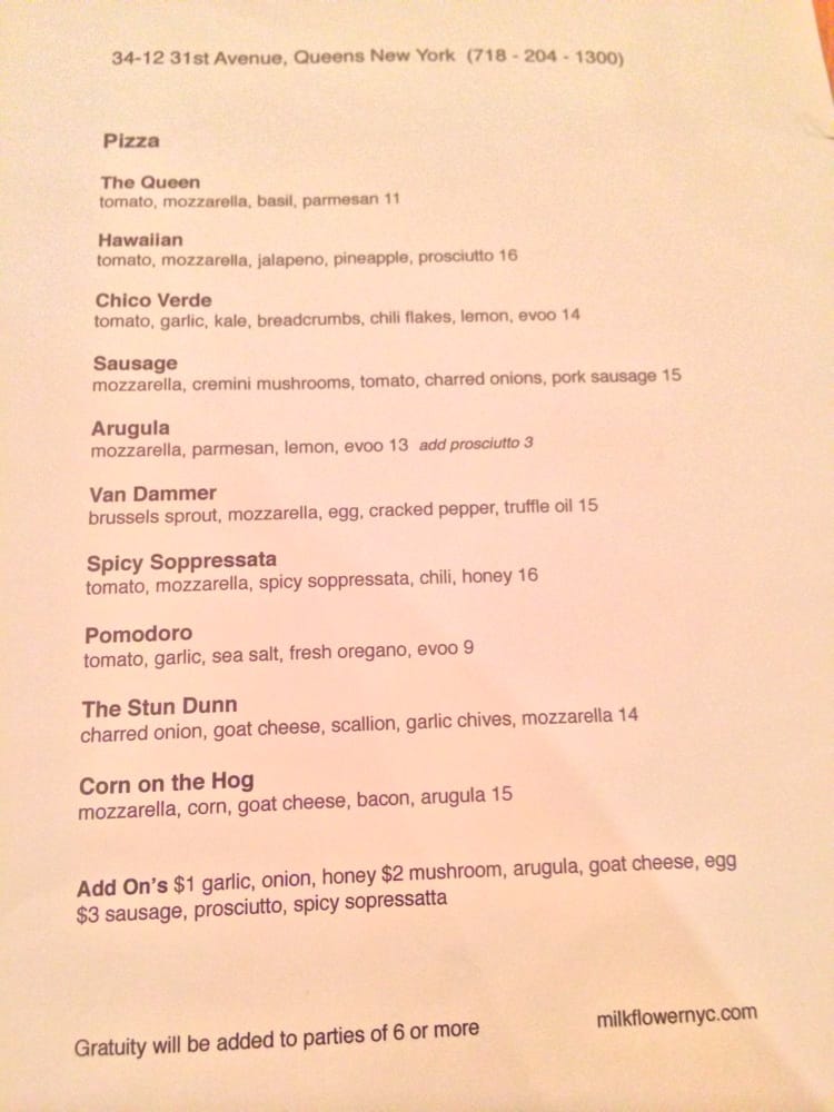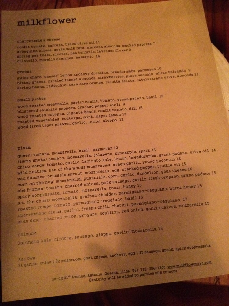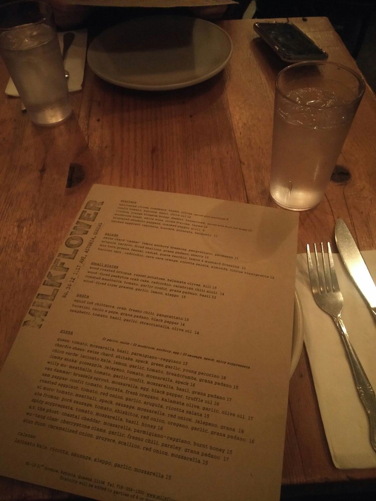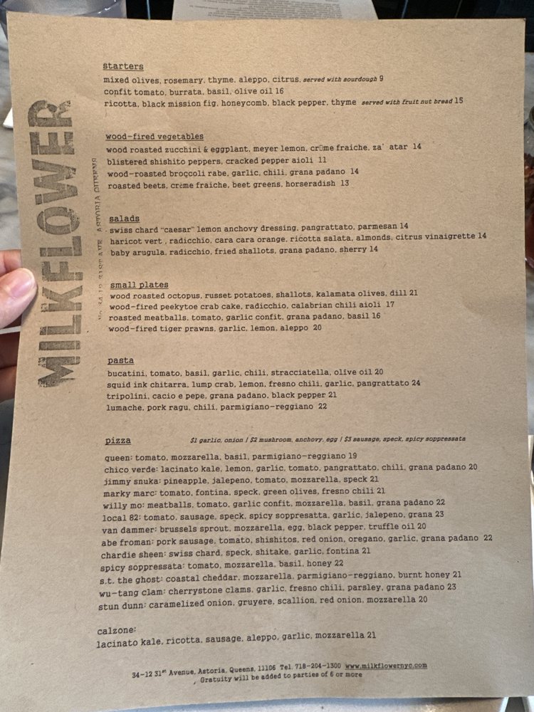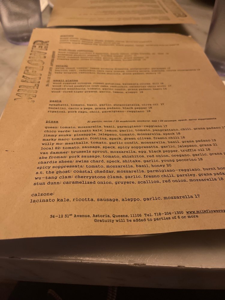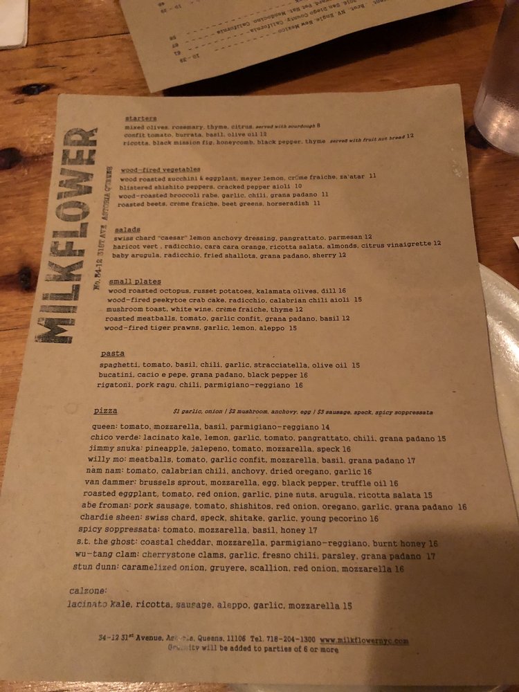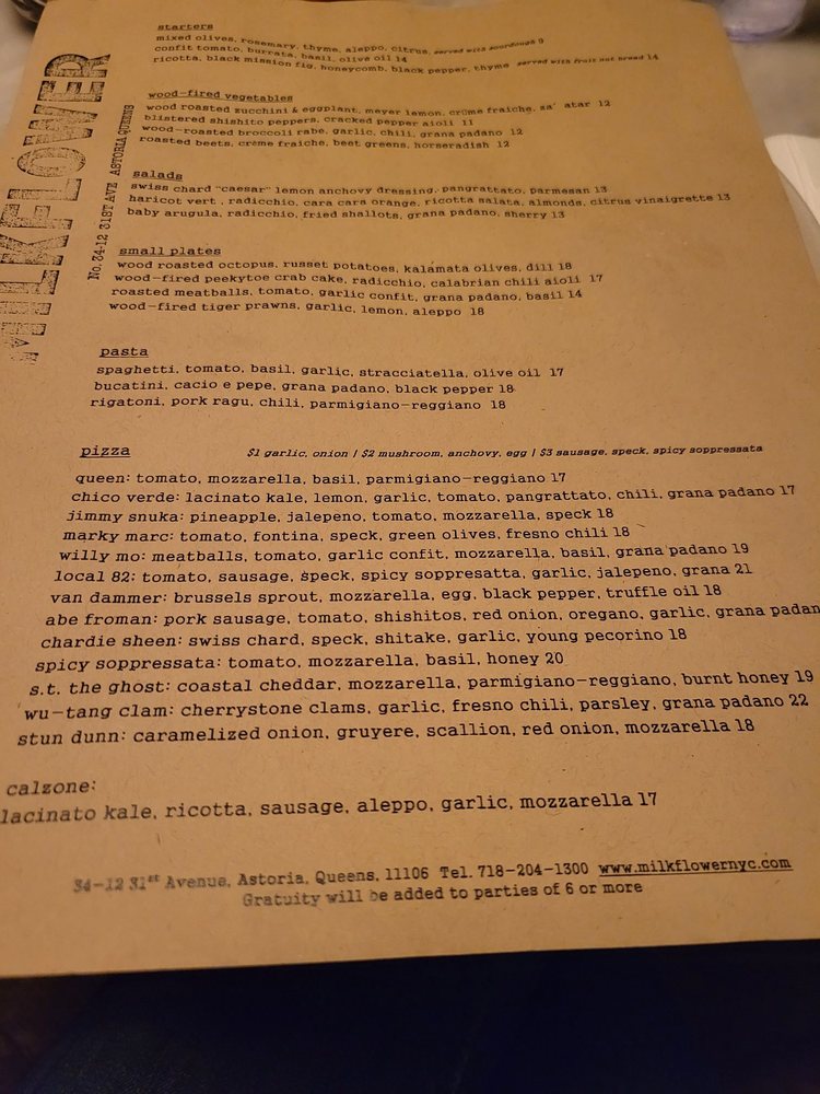 Milkflower is a casual dining spot in Astoria, NY offering delivery, takeout, and reservations with a menu that caters to vegans and vegetarians. The restaurant features wood-fired plates like Tiger Prawns and Octopus, along with delectable starters like Ricotta with Black Mission Fig. Salads include Swiss Chard Caesar and Baby Arugula options. Customers rave about the delicious pizzas, with standout choices like the Van Dammer topped with brussel sprouts and a fried egg. The service is praised for being fast and friendly, making it a go-to for many. Overall, Milkflower impresses with its quality ingredients, flavorful dishes, and inviting ambiance.